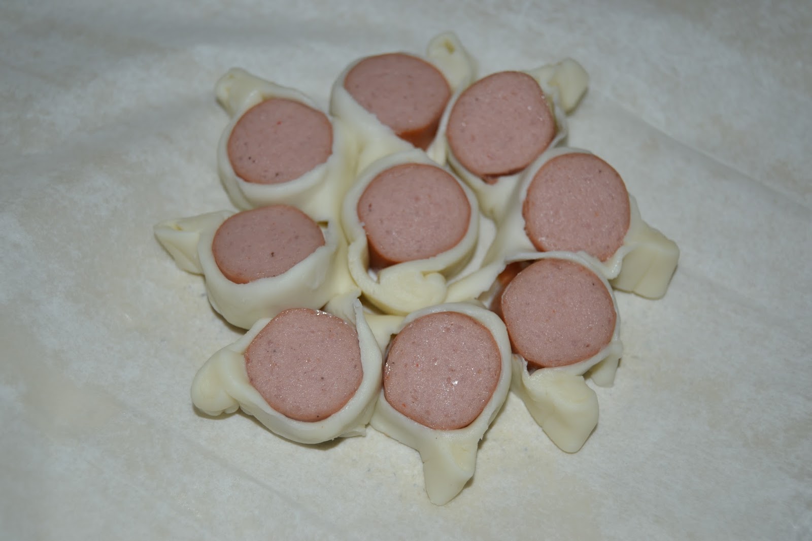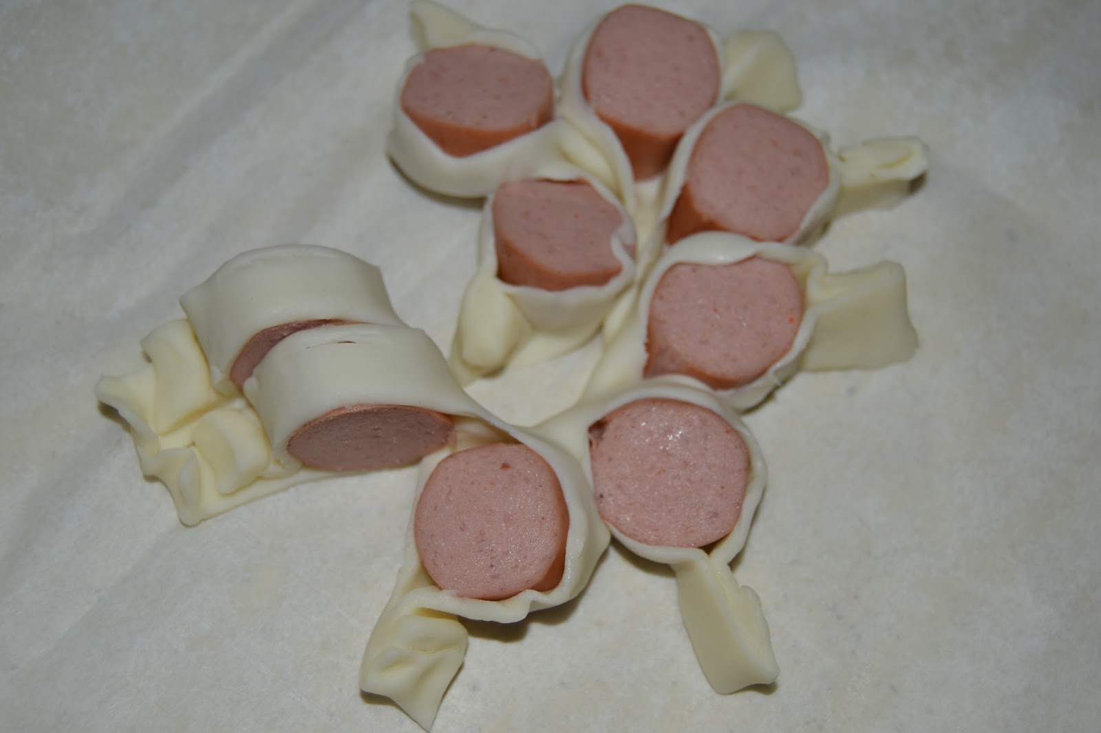 I l'enrosquem donant-li forma de flor. Amb un frankfut n'hi ha per una flor i mitja aprox.