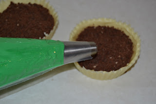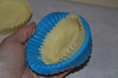 Agafem motlles de silicona de cupcakes, i els pintem amb xocolata blanca desfeta.