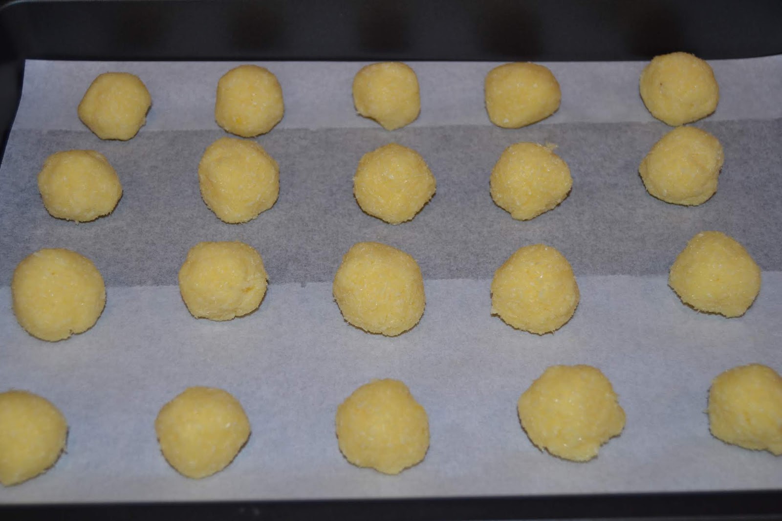 Amb les mans (si cal una mica untades d'oli) aneu fent boletes i dipositant-les sobre una safata folrada de paper de forn.