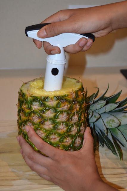 Primer de tot, talleu la part superior de la pinya, i amb l'estri dissenyat aital efecte (que podreu trobar a qualsevol botiga de coses de cuina) la buideu.