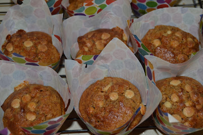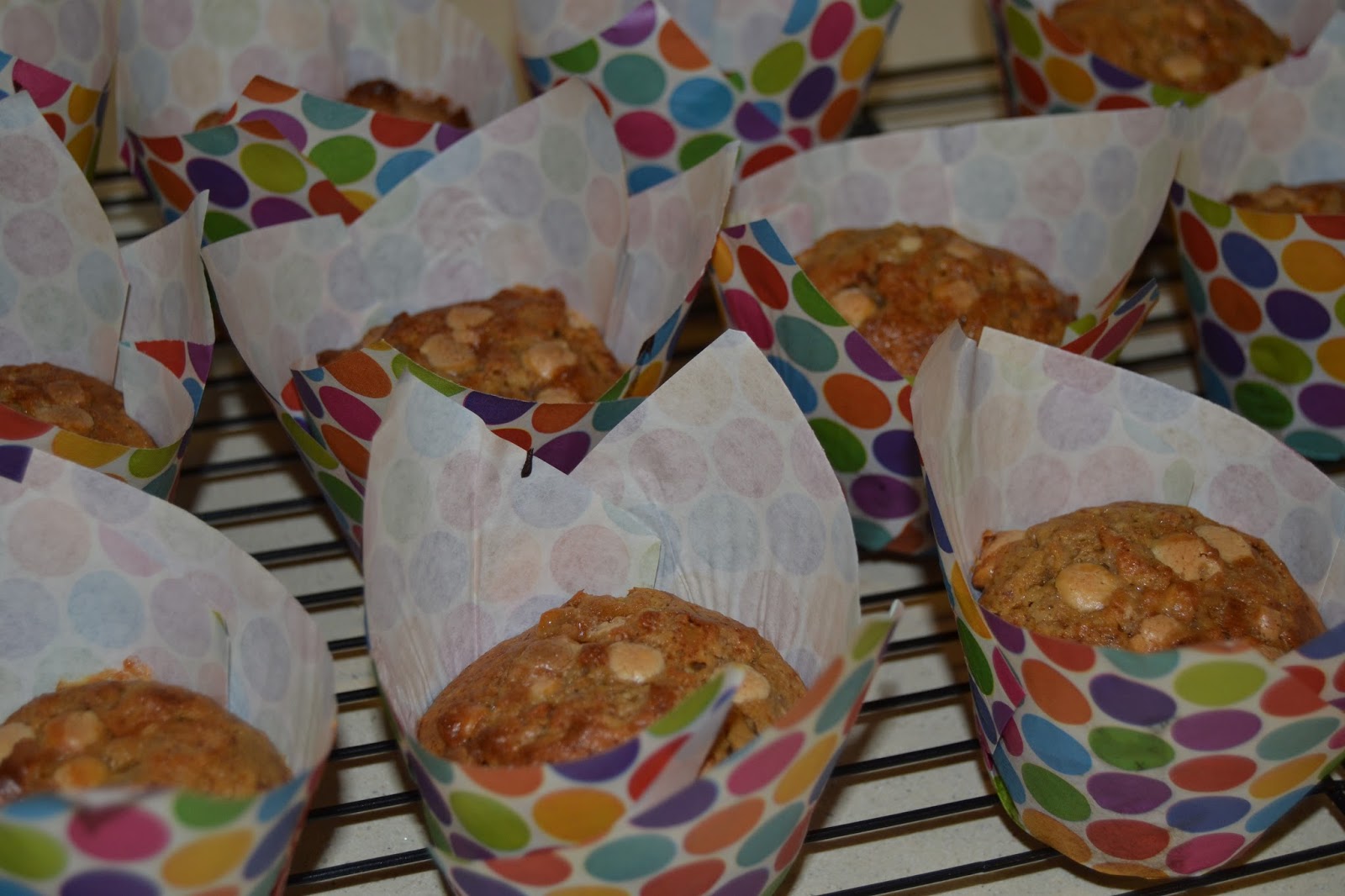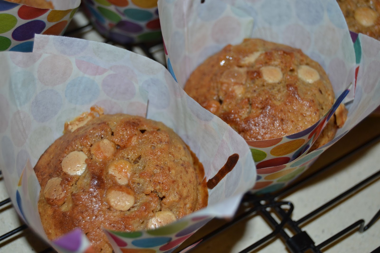 Els muffins són una bona opció a tothora...per esmorzar, a mig matí, per berenar, o amb un got de llet, abans d’anar a dormir...en fi...que és impossible resistir-s’hi...i si són aquests, que queden super esponjosos, humits per dins, amb gustet a plàtan, i amb un toc de cacauet i xocolata blanca...ja us podeu imaginar...A més, en aquesta ocasió, van ben mudats amb uns papers de topos, de vius colors, que vaig portar d’Alemanya!!! A veure què us semblen!