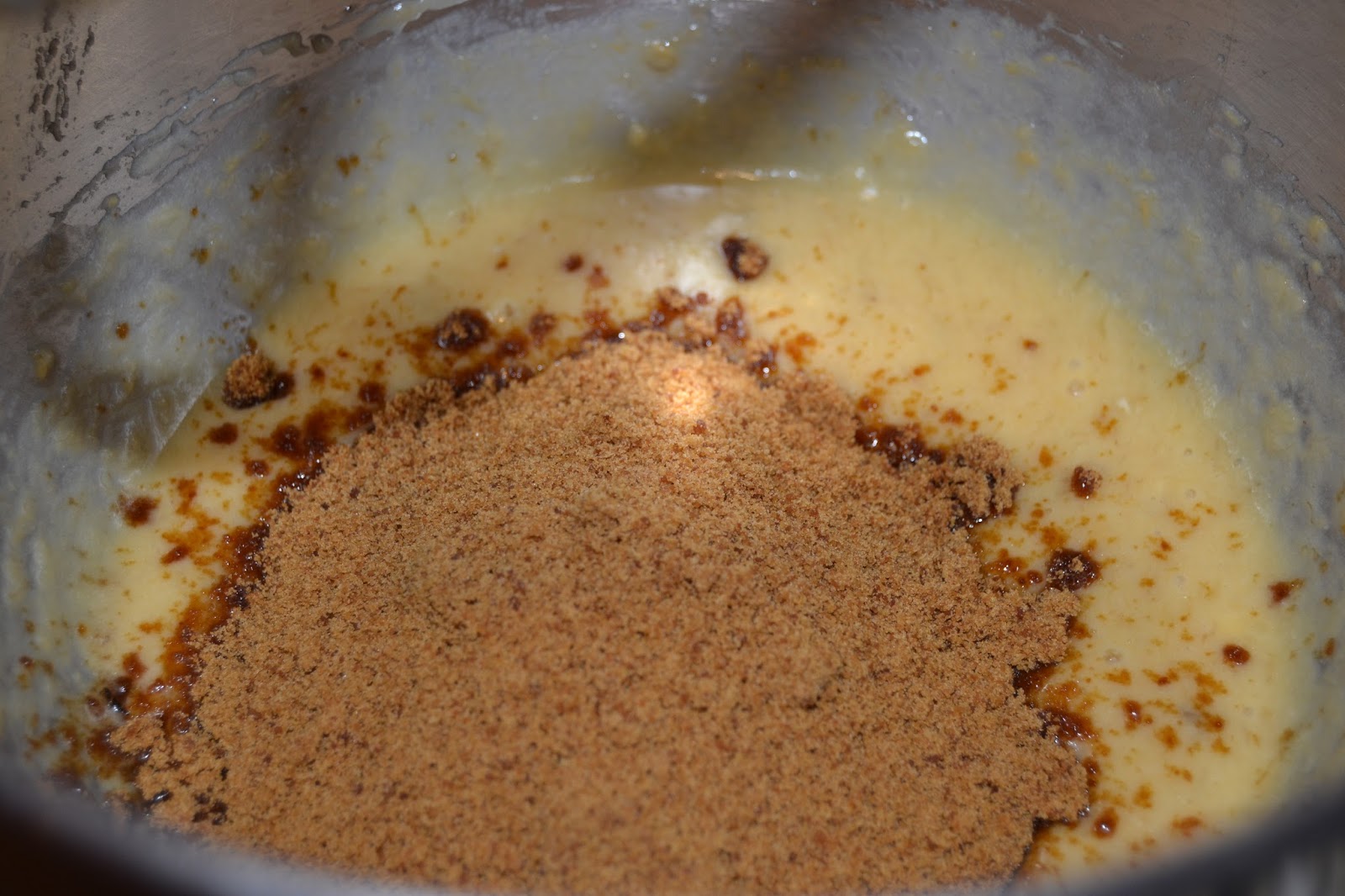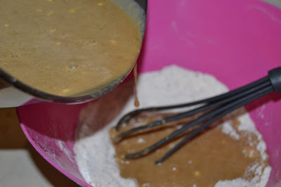 En els ingredients sòlids, hi aboquem, poc a poc, els líquids, sense deixar de remenar, ja amb un batedor manual.