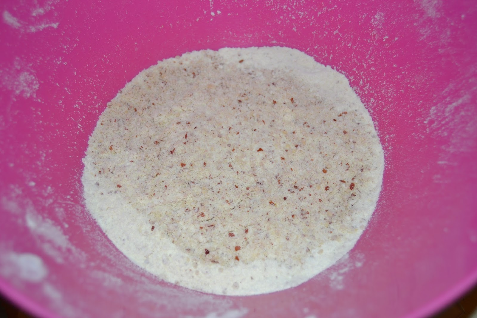 Un cop llestos els ingredients líquids, en un bol, barregem tots els sòlids (menys el sucre, que ja l'haurem incorporat). És a dir, farines, llevat i sal.