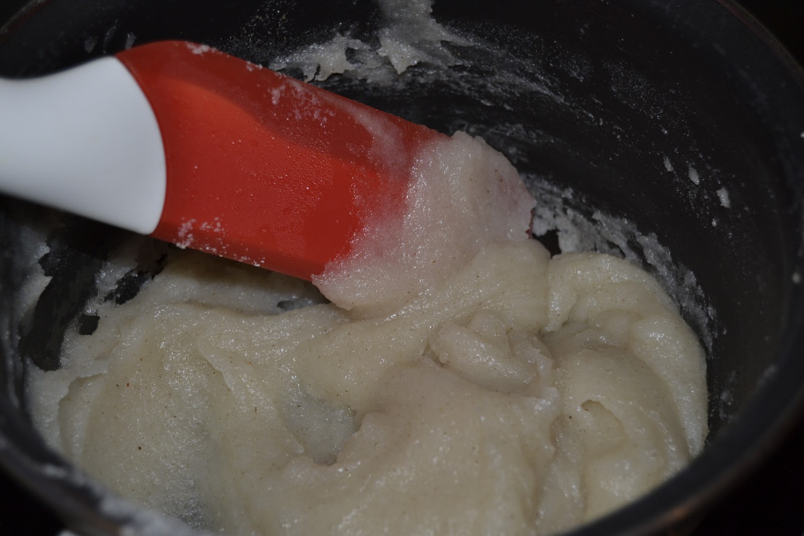 Col.loqueu la farina d'arròs, l'aigua i el sucre en un caçó, a foc baix, i remeneu i remeneu fins que quedi molt espès, una massa treballable.