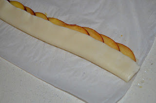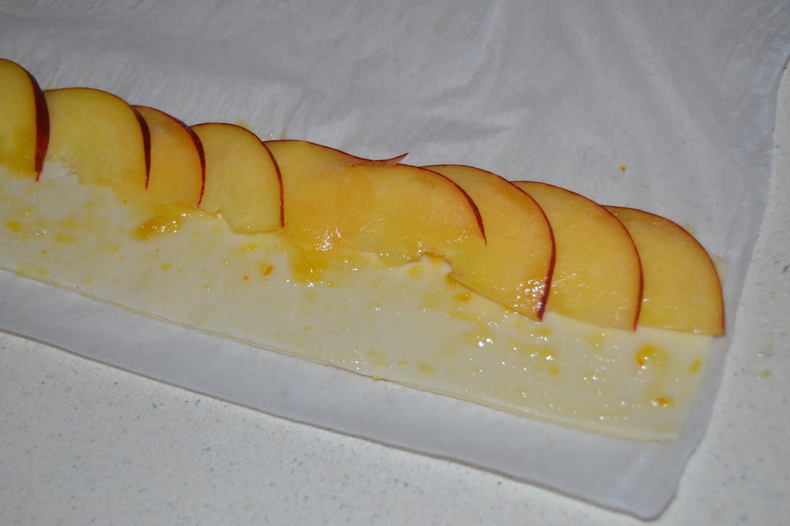 Col.loquem les rodanxes de nectarina, amb la part de la pell cap amunt, en una meitat de la tira de pasta de full untada de melmelada de taronja.