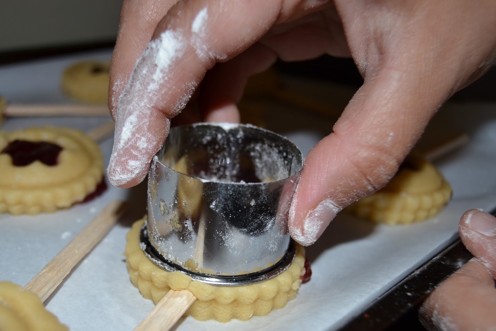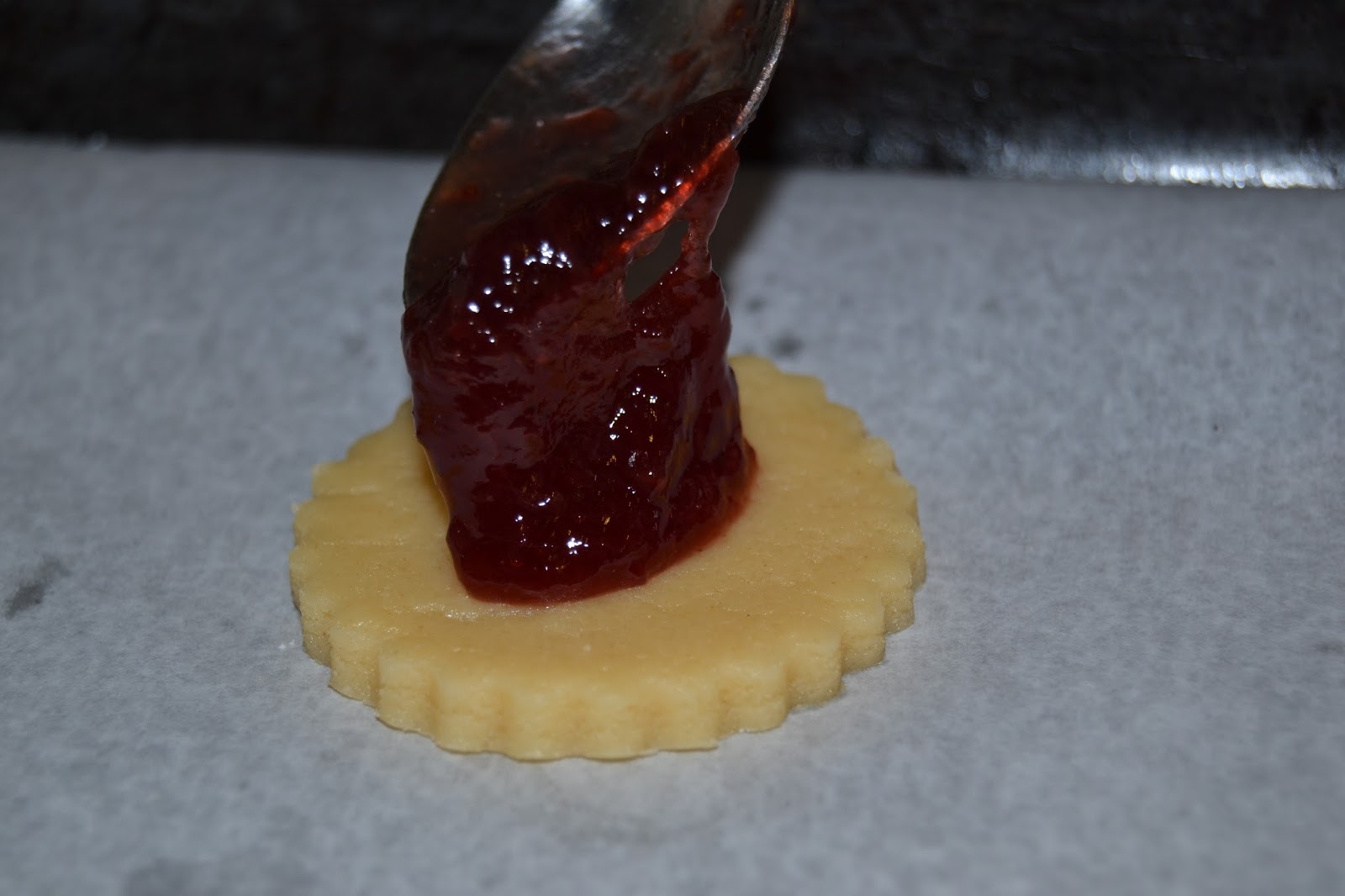 Tapem la melmelada amb una altra porció de massa, igual que la base, però a la que haurem extret el centre amb un tallador ben petit, amb la forma que us agradi.