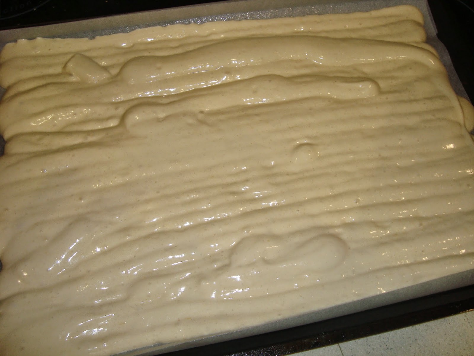 Un cop la massa a punt, es posa dins una mànega de plàstic, sense boca, i es reparteix per damunt una safata que haurem folrat amb paper d'enfornar, i ruixat amb spray antiadherent.