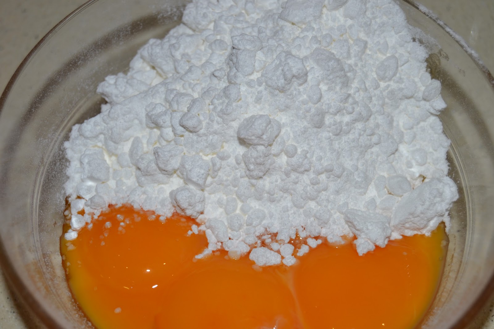 Mentrestant, en un bol, bateu molt i molt be els rovells i el sucre, fins que blanquegin.