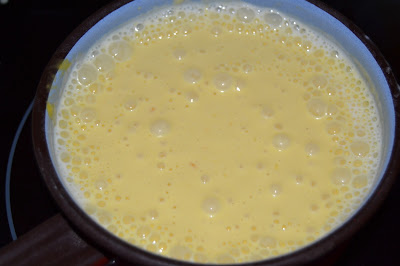Quan la llet estigui calenta (no cal que bulli), l'aboquem damunt els rovells, remenem, i tornem a posar la barreja al foc.
